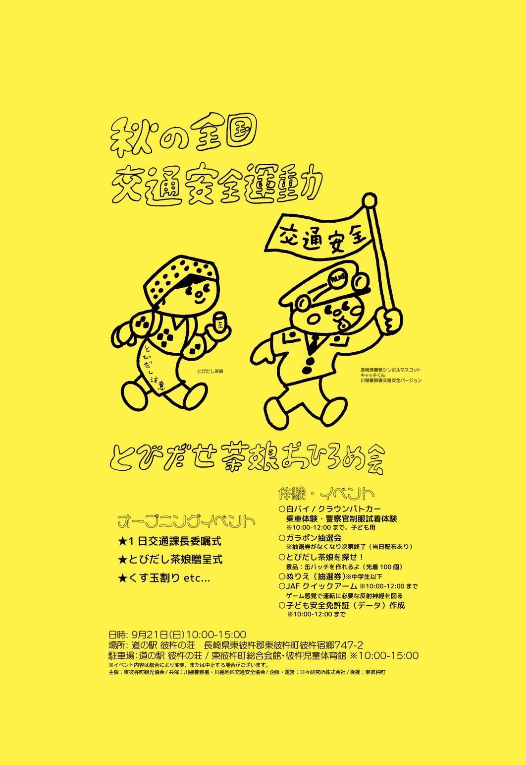 秋の全国交通安全運動 2025.09.19 イベント詳細 日付: 2025年9月21日 10:00 – 15:00 カテゴリ: イベント, 体験・ワークショップ, 町内でのイベント 9月21日に道の駅彼杵の荘にて『とびだせお茶娘おひろめ会』が行われます。 交通安全運動の一環として、白バイやパトカーの乗車体験、抽選会などのイベントも開催予定です。🚓 配られるチラシは抽選券にもなっているので、ぜひ塗り絵をして参加してください!🎨 日時:9月21日(日) 10:00〜15:00 場所:道の駅 彼杵の荘 駐車場:道の駅 彼杵の荘/東彼杵町総合会館・児童体育館