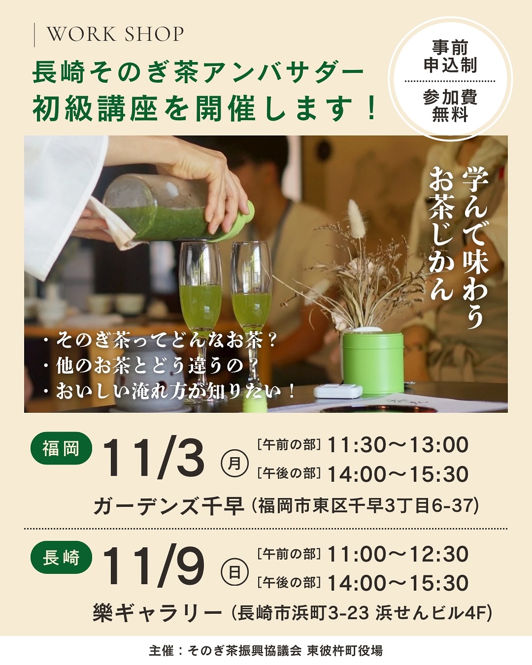 長崎・東彼杵町で生産される「そのぎ茶」をより多くの方に知ってもらい、そのおいしさを楽しんでいただきたい!そんな思いで、そのぎ茶に触れることのできる、さまざまなイベントを開催しています。(主催:そのぎ茶振興協議会・東彼杵町役場)